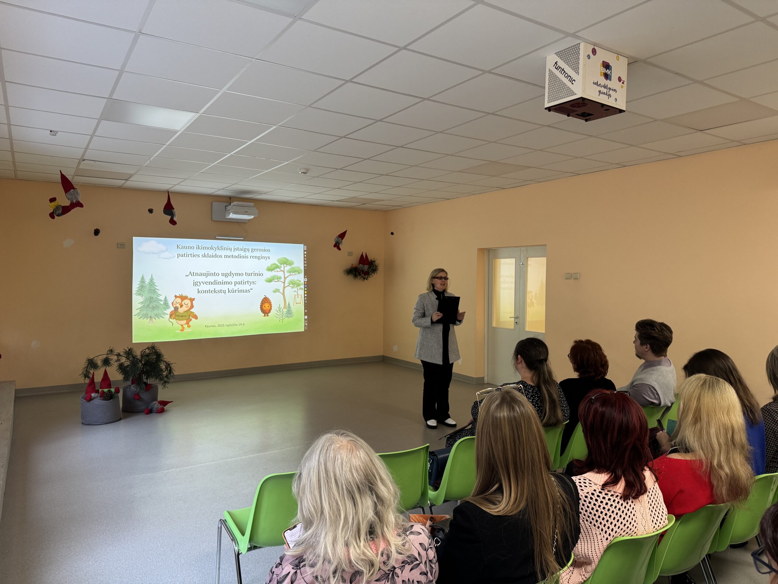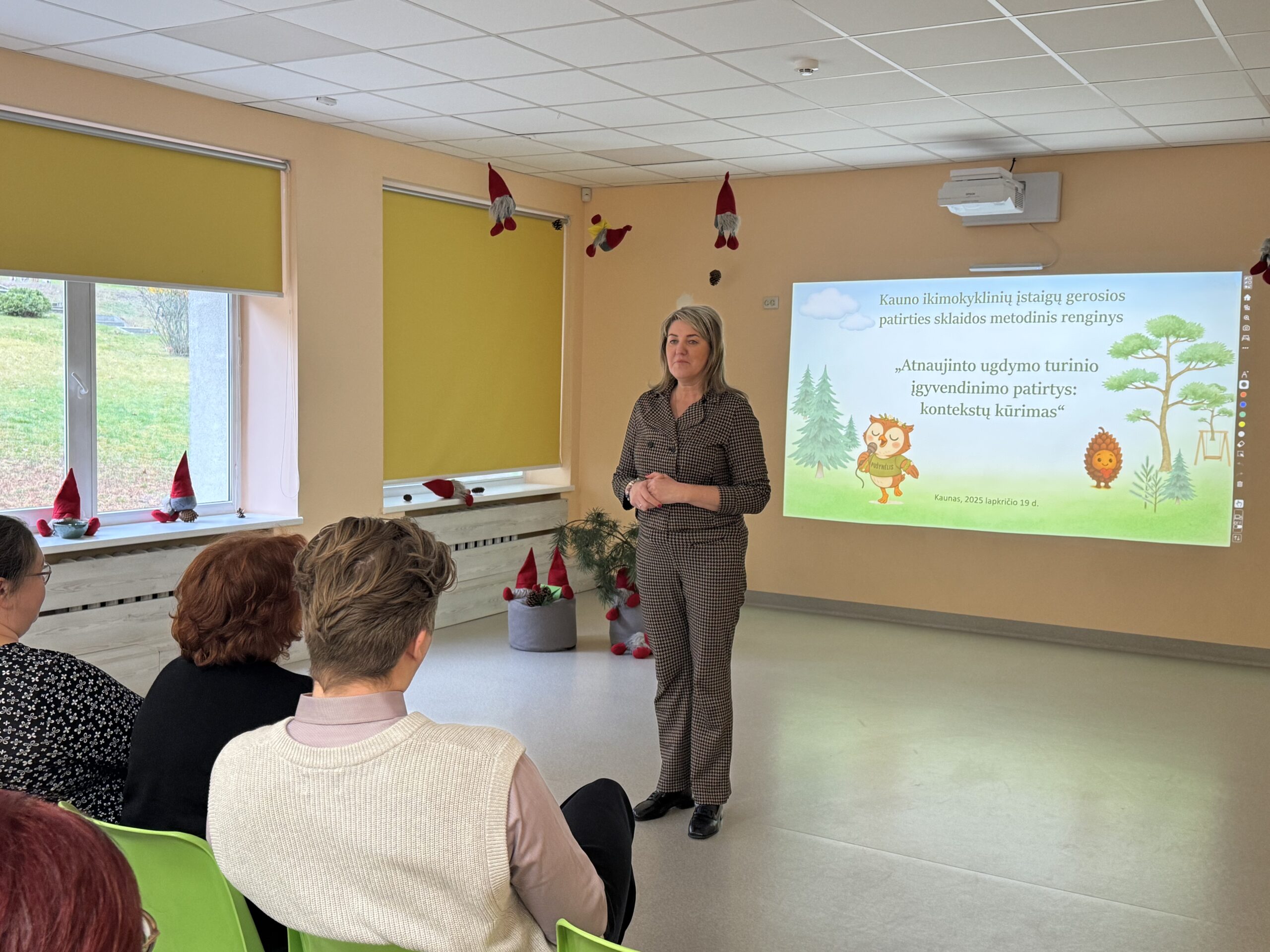 Lapkričio 19 d. mūsų įstaigoje vyko metodinis renginys „Atnaujinto ugdymo turinio įgyvendinimo patirtys: kontekstų kūrimas“, kuriame tinklaveikoje su kitais bendrystėje Kauno lopšeliais darželiais „Naminukas“, „Girstutis“ ir „Lakštutė“ pristatyti penki įvairaus pobūdžio pranešimai. Metodinio renginio tikslas – pasidalinti atnaujinto ugdymo turinio įgyvendinimo gerąją patirtimi: ugdymosi kontekstų kūrimo praktiniais pavyzdžiais. Pabrėžtina, kad atnaujinta IU programa skatina mokytoją būti partneriu, o ne žinių perteikėju. Todėl siekiant kokybiško IU programos įgyvendinimo svarbu nuolatinis reflektavimas, bendradarbiavimas ir profesinis augimas. O kontekstinis ugdymas padeda vaikams ne tik mokytis, bet ir patirti sėkmę, džiaugsmą bei ryšį su pasauliu.